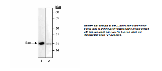 The 6A7 antibody recognizes human, mouse and rat Bax. The 6A7 antibody reacts with an epitope between amino acids 12-24 of Bax, and