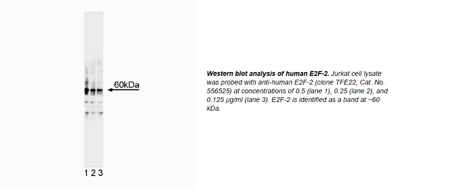 E2F-2 migrates at a molecular weight of 60 kDa by SDS/PAGE. Clone TFE22 recognizes an epitope between amino acids 1 through 85 of