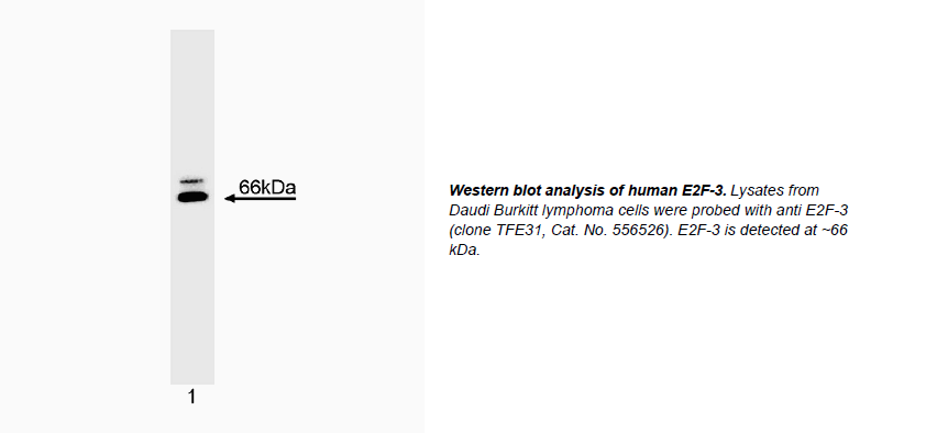 other E2F members. E2F-3 migrates at a molecular weight of 66 kDa by SDS/PAGE. Clone TFE31 recognizes an epitope between amino