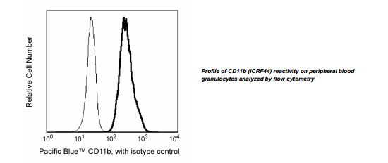 The ICRF44 monoclonal antibody reacts with CD11b, the 165-kDa adhesion glycoprotein that associates with the 95-kDa integrin β2 (CD18) to form the CD11b/CD18 complex, also known as Mac-1 or CR3. CD11b is expressed on activated lymphocytes, monocytes, granulocytes, and a subset of NK cells. CD11b functions in cell-cell and cell-substrate interactions and is a receptor for iC3b, CD54 (ICAM-1), CD102 (ICAM-2) and CD50 (ICAM-3). This antibody significantly inhibits polymorphonuclear leukocyte aggregation in response to fMLP.