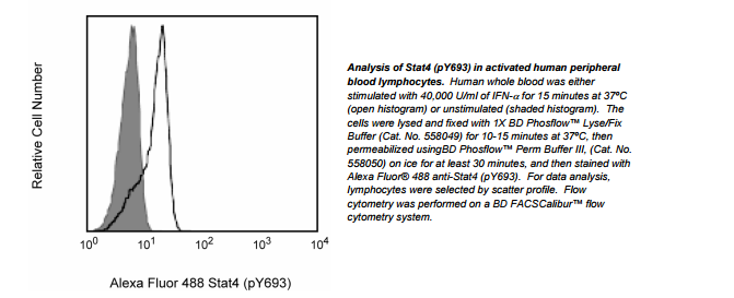 The Stat proteins function both as cytoplasmic signal transducers and as activators of transcription. Seven mammalian Stat proteins have been identified: Stat1-4, Stat5a, 5b, and Stat6. Stat4 has been shown to play an important role in development of T helper cells, specifically the Th1 subset. Stat4 is activated by IL-12 and by type 1 interferons. Knockout mice supported the role that Stat4 plays in IL-12 signaling because lymphocytes from Stat 4-/- mice could neither differentiate into Th1 cells nor produce IFN-γ in response to treatment with IL-12. IFN-γ plays an important role in host defense. A key component in the activation of Stat4 is the phosphorylation on tyrosine and serine residues in response to IL-12 stimulation. IL-12 stimulation leads to the phosphorylation of Stat4 on tyrosine 693 and serine 721. Transcriptional activity of Stat4 has been shown to be significantly reduced when residues Y693 and S721 are mutated. Clone 38/p-Stat4 has been confirmed to recognize mouse phospho-Stat4 with western blot application using Purified Mouse Anti-Stat4 (pY693), Cat. Nos. 612739 & 612738.