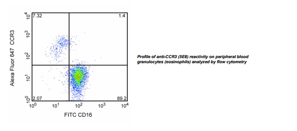 Antibody 5E8 recognizes an epitope in CCR3. CCR3 is a G protein-linked, 7 transmembrane, chemokine receptor expressed on a variety of hematopoietic cells. Similar to CCR5 and CXCR4, CCR3 can be a co-receptor for HIV-1. It is primarily found on eosinophils and basophils during atopic conditions, dermatitis, allergic rhinitis, conjunctivitis and bronchial asthma. Chemokines like RANTES, Eotaxin, MCP-3, MIP1α have been reported to act as ligands for CCR3 and stimulate CCR3+ cells. Eotaxin stimulates Th2 cells expressing CCR3. Other studies describe HIV-1 specific T cell cytotoxicity can be mediated by RANTES and Eotaxin through CCR3. CCR3 expressed on dendritic cells may have a biological role on cell-cell interaction during antigen presentation. CCR3 has been clustered as CD193 in the HLDA VIIIth workshop