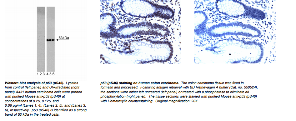 The p53 protein is critical to regulation of normal cell growth and is a suppressor of tumor cell proliferation. Inactivation of p53 by a number of mechanisms, such as missense mutations or interaction with oncogenic viral or cellular proteins, can result in tumor progression. Mutations and/or allelic loss of the p53 gene are associated with a wide variety of human tumors. Known to have a role in transcriptional regulation, p53 suppresses various promoters containing TATA elements in an apparently sequence-independent fashion. p53 also binds to DNA in a sequence-specific manner via recognition of a 20-bp consensus-binding site. This interaction stimulates the expression of genes downstream of the p53 binding site. A number of genes that contain p53-binding sites have been identified, including MDM2, GADD45, and muscle creatine kinase. MDM2 mediates feedback inhibition of p53, which is prevented by phosphorylations of p53 amino-terminal serines and threonines. UV radiation-induced phosphorylation of Serine 46 (S46) is mediated by homeodomain-interacting protein kinase-2 (HIPK2) and is involved in the promotion of apoptosis. Other stress stimuli mediate S46 phosphorylation in p53 via as yet unidentified kinase(s).