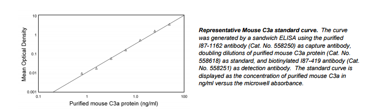 The purified I87-1162 antibody reacts with the mouse C3a protein. The I87-1162 antibody is specific for a neoepitope exposed in mouse C3a/C3adesArg and does not cross-react with mouse C3. This capacity makes antibody I87-1162 a preferential capture antibody for direct detection of mouse C3a from plasma or serum samples in an ELISA sandwich assay. Anaphylatoxin C3a is a bioactive cleavage product released from plasma component C3 during complement activation and is involved in mediation of a variety of cellular immune responses, as well as being a potent pro-inflammatory agent. The release of this cleavage product is a reliable indicator of in vivo or in vitro complement activation.