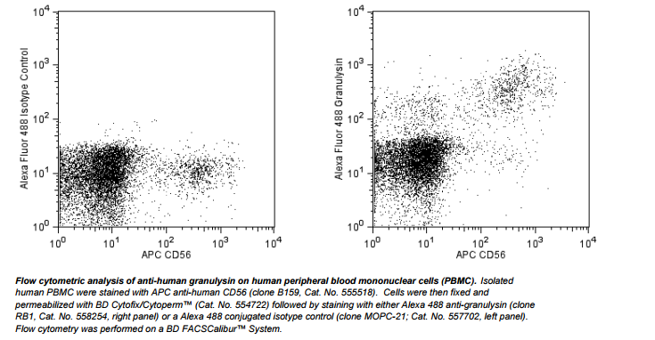 The monoclonal antibody RB1 recognizes both 15- and 9kD forms of human granulysin, a protein present in granules of human natural killer (NK) cells and activated cytotoxix T lymphocytes (CTLs). It is cytolytic against both tumor and microbial targets and has been found to kill extracellular and intracellular mycobacterium tuberculosis through a granule-dependent mechanism. Granulysin is a member of a larger family of proteins known as saposin-like proteins (SAPLIP) that are thought to associate with lipids. The crystal structure of granulysin suggests that it functions as a lytic molecule. To date, no granulysin homolog has been found in mice, precluding the generation of granulysin knockout animals.