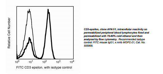 Monoclonal antibody APA1/1 reacts with the intracellular domain of the epsilon chain of the CD3 molecule (CD3-ε). This antibody does not react with the extracellular region of CD3-ε. The assembly of the T cell antigen receptor (TCR)-CD3 complex has been suggested to take place by pairwise interactions of the CD3-ε subunit with either CD3-γ or CD3-δ. These dimers then associate with the TCR heterodimer a/β or γ/δ, and the CD3-ζ homodimer to form the full complex. Studies show that antibodies APA1/1 and SP34 gave a strong reaction with COS cells singly transfected with CD3-ε. Other anti-CD3 antibodies (OKT3, WT31, UCHT1, Leu4) did not react with COS cells singly transfected with CD3-ε. This reagent could be useful for the study of T cell development or the study of conformational changes of CD3-ε upon ligand binding to TCR-CD3 complex.