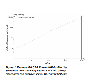 The BD™ CBA Human MIP-1α Flex Set is a bead-based immunoassay capable of measuring human Macrophage Inflammatory Protein-1α (MIP-1α), also known as CCL3, in serum, plasma, and cell culture supernatant samples. Human reactivity was determined by testing samples with the BD CBA Human MIP-1α Flex Set. The biology and function of MIP-1α has been extensively reviewed in the literature. For more information on bead-based immunoassays, refer to the product insert for the BD CBA Human Soluble Protein Master Buffer Kit (Cat. No. 558264 or 558265).