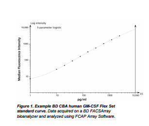 This BD™ CBA Flex Set contains one vial each of Capture Bead and PE Detection Reagent and two vials of Standard. The Capture Bead and PE Detection Reagent components of this flex set have been formulated to a 50x concentration to ensure product performance when multiplexed. The Standard component is lyophilized and should be transferred to a 15 mL polypropylene tube for reconstitution. When reconstituted in 4.0 mL Assay Diluent, the standard has a protein concentration of 2,500 pg/mL. Discard unused reconstituted standard, do not store or reuse. Store lyophilized standard and other components at 4°C. Protect Capture Beads and the PE Detection Reagent from prolonged exposure to light