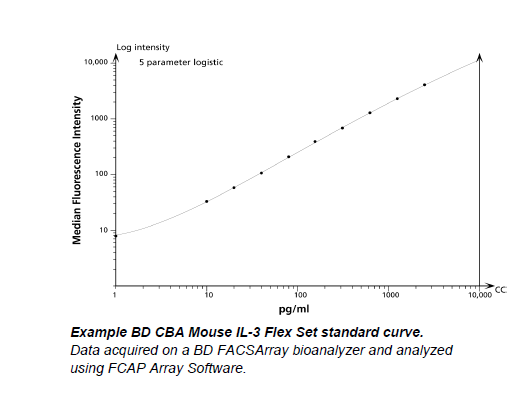The BD™ CBA Mouse IL-3 Flex Set is a bead-based immunoassay capable of measuring mouse interleukin-3 (IL-3) in serum and cell culture