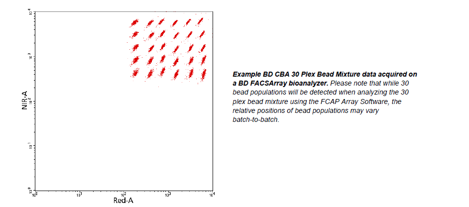 The BD™ Cytometric Bead Array (CBA) 30 Plex Bead Mixture is a cocktail containing 30 bead populations from the BD CBA Flex Set.