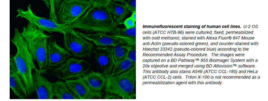 Store undiluted at 4°C and protected from prolonged exposure to light. Do not freeze. The monoclonal antibody was purified from tissue culture supernatant or ascites by affinity chromatography. The antibody was conjugated to Alexa Fluor® 647 under optimum conditions, and unreacted Alexa Fluor® 647 was removed.