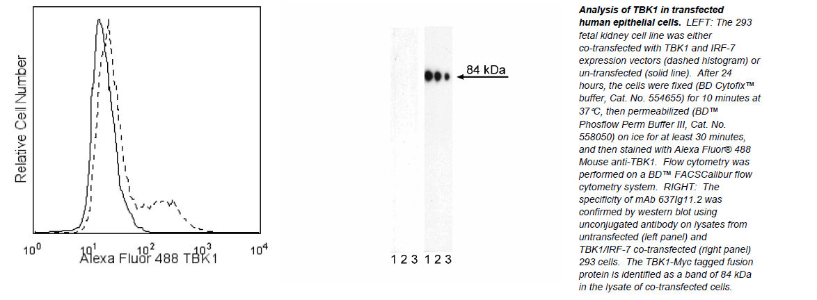 The 637Ig11.2 monoclonal antibody recognizes human TBK1, regardless of phosphorylation status. Our in-house testing is performed on a