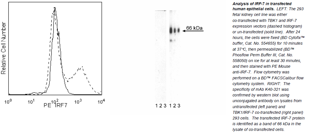 The K40-321 monoclonal antibody recognizes human IRF-7, regardless of phosphorylation status. Our in-house testing is performed on a cell