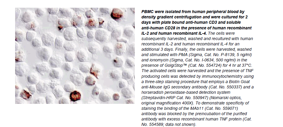 cells, T cells and fibroblasts. The immunogen used to generate the MAb11 hybridoma was recombinant human TNF. The use of the MAb11