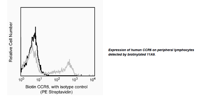 The monoclonal antibody 11A9 reacts with the human CC chemokine receptor, CCR6. CCR6 (previously known as BN-1, CKR-L3, DRY6,