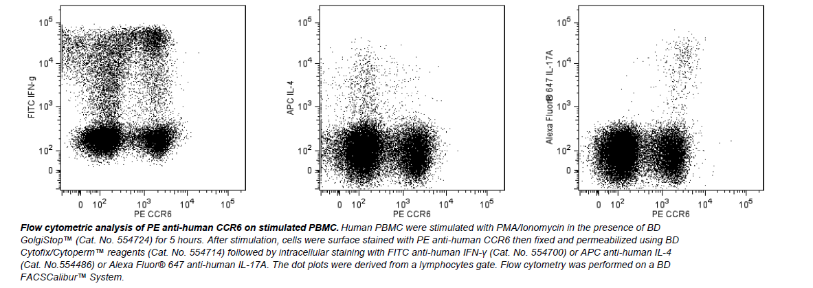 CXCR2, CXCR3, CXCR4 and CXCR5 transfectants. This antibody is NOT a neutralizing antibody. CCR6 had been clustered as CD196 in