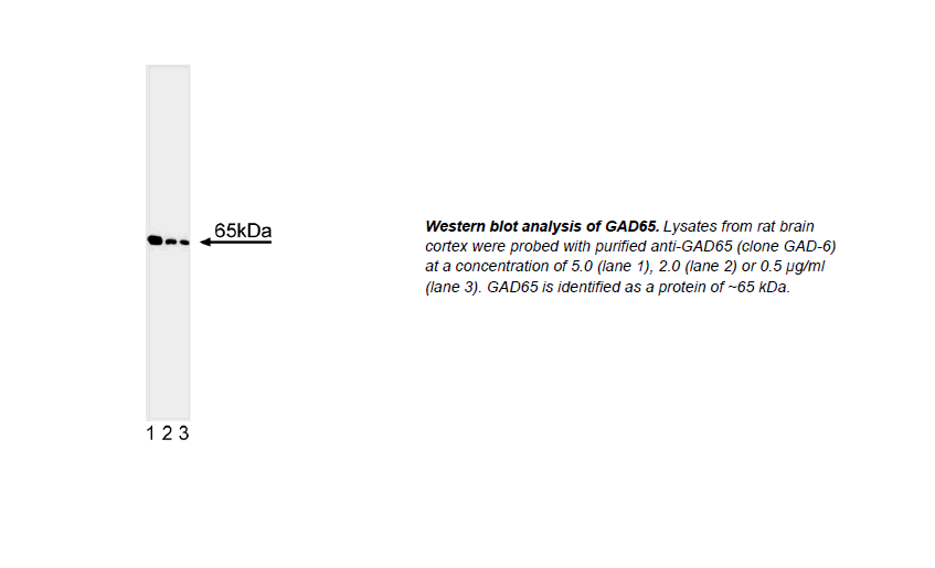 Purified GAD65 from rat brain was used as the immunogen. The specific epitope recognized by this clone is a linear epitope localized in the