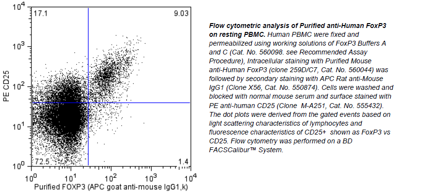 FOXP3 is mutated in scurfy (sf) mice. The 259D/C7 antibody reacts with all currently identified isoforms of human FoxP3 and is