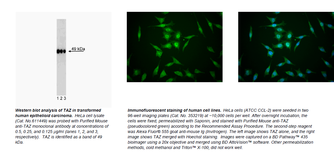 Taz is a 49-kDa transcriptional co-activator with a PDZ-binding motif and is regulated by binding with 14-3-3 proteins. It plays a key role in differentiation of mesenchymal stem cells into either osteoblasts or adipocytes via interactions with key transcription factors Runx2 and PPAR γ . More recently, Taz was found to be a component of an E3 ubiquitin ligase involved in ubiquitin-dependent substrate proteolysis by mediating its interaction with the F-box protein β -Trcp. Therefore, Taz has dual functions of regulating protein degradation and transcription.