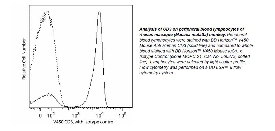 The antibody is conjugated to BD Horizon™ V450, which has been developed for use in multicolor flow cytometry experiments and is