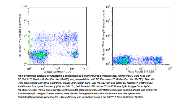 The GB11 antibody specifically reacts with human granzyme B, a serine protease of approximately 32 kDa. Granzyme B is stored in the granules of cytotoxic T lymphocytes and NK cells along with the pore-forming protein perforin. In the classic model of target cell lysis, perforins create holes in the target cell membrane allowing entrance of granzymes. Granzyme B has been shown to act on specific substrates including caspase-3, -7, -9, and -10 which in turn give rise to enzymes that mediate apoptosis. Granzyme B may also be involved in the hydrolysis of extracellular matrix components. Detectable levels of granzyme B have been detected in sera from healthy volunteers. The immunogen used to generate the GB11 hybridoma was human granzyme B isolated from an NK cell line. The antibody is conjugated to BD Horizon™ V450, which has been developed for use in multicolor flow cytometry experiments and is available exclusively from BD Biosciences. It is excited by the Violet laser Ex max of 406 nm and has an Em Max at 450 nm. Conjugates with BD Horizon™ V450 can be used in place of Pacific Blue™ conjugates.
