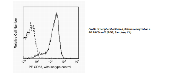 Reacts with a 53 kDa, type III lysosomal glycoprotein, expressed on activated platelets, monocytes and macrophages. This molecule is also