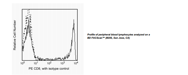 The RPA-T8 monoclonal antibody specifically binds to CD8 alpha (CD8α) . CD8α is a type I transmembrane glycoprotein and a member of the immunoglobulin superfamily. CD8α is expressed by the majority of thymocytes, by subpopulations of αβ T cells and γδ T cells and by some NK cells. Cell surface CD8α is expressed either as a disulfide-linked homodimer (CD8αα) or as a heterodimer (CD8αβ) when disulfide-bonded to a CD8 beta chain (CD8β) . CD8-positive αβ T cells coexpress both CD8αα homodimers and CD8αβ heterodimers whereas some γδ T cells and NK cells express CD8αα homodimers. CD8 plays important roles in T cell activation and selection. The extracellular IgSF domain of CD8 α binds to a non-polymorphic determinant on HLA class I molecules (α3 domain) and enables CD8 to function as a co-receptor with MHC class I-restricted TCR during T cell recognition of antigen. The cytoplasmic domain of CD8α associates with Lck, a Src family protein tyrosine kinase that is involved in intracellular signaling. The RPA-T8 and HIT8a monoclonal antibodies are not cross-blocking. This clone has been reported to react with a subset of peripheral blood lymphocytes, but not monocytes nor granuloyctes, of baboon and both rhesus and cynomolgus macaque monkey. In general, a higher frequency of CD8+ and CD4+CD8+ lymphocytes are observed in non-human primates compared to normal human donors.