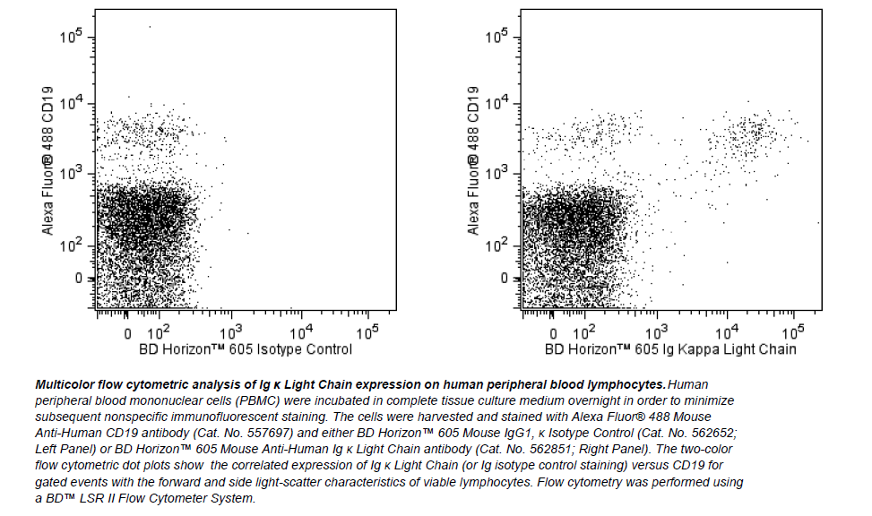 This antibody is conjugated to BD Horizon BV605 which is part of the BD Horizon Brilliant™ Violet family of dyes. With an Ex Max of