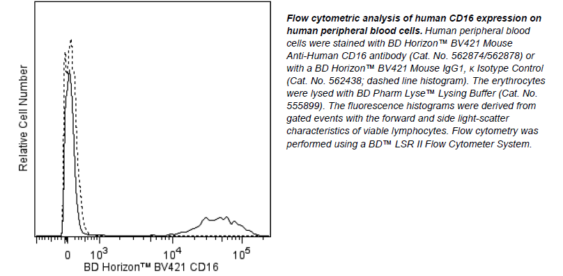 The antibody was conjugated to BD Horizon™ BV421 which is part of the BD Horizon™ Brilliant Violet™ family of dyes. With an Ex Max