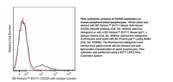 The antibody was conjugated to BD Horizon™ BV711 which is part of the BD Horizon™ Brilliant Violet™ family of dyes. This dye is a