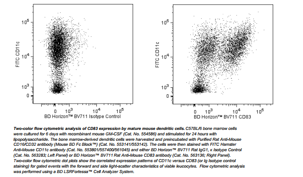 The antibody was conjugated to BD Horizon™ BV711 which is part of the BD Horizon™ Brilliant Violet™ family of dyes. This dye is a