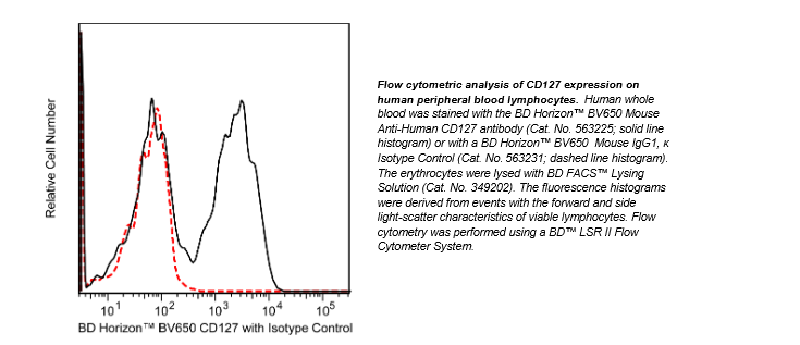 The antibody was conjugated to BD Horizon™ BV650 which is part of the BD Horizon™ Brilliant Violet™ family of dyes. This dye is a