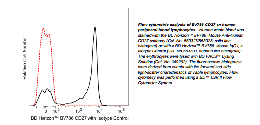 The antibody was conjugated to BD Horizon™ BV786 which is part of the BD Horizon™ Brilliant Violet™ family of dyes. This dye is a