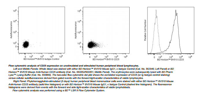 The antibody was conjugated to BD Horizon™ BV510 which is part of the BD Horizon™ Brilliant Violet™ family of dyes. With an Ex Max