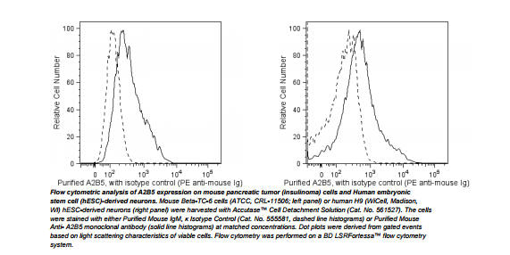 The 105/A2B5 monoclonal antibody binds to gangliosides in neural tissue in the retina, brain, spinal cord, and dorsal root ganglia. The antigenic gangliosides are found on the plasma membrane of neural cell bodies, but not axons or dendrites. Expression levels of the gangliosides that mAb 105/A2B5 binds to, including GT3 and its O-acetylated derivative, decrease during embryonic development of the brain. Thus, mAb 105/A2B5 may be used to monitor the maturation of brain tissue. A2B5 antigens have also been associated with numerous tumors, including glioblastoma multiforme tumor cells, pancreatic islet tumor cells, and rat insulinoma cells, and are thought to contribute to chemoresistance and increased tumor proliferation and recurrence.