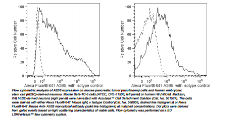 The 105/A2B5 monoclonal antibody binds to gangliosides in neural tissue in the retina, brain, spinal cord, and dorsal root ganglia. The antigenic gangliosides are found on the plasma membrane of neural cell bodies, but not axons or dendrites. Expression levels of the gangliosides that mAb 105/A2B5 binds to, including GT3 and its O-acetylated derivative, decrease during embryonic development of the brain. Thus, mAb 105/A2B5 may be used to monitor the maturation of brain tissue. A2B5 antigens have also been associated with numerous tumors, including glioblastoma multiforme tumor cells, pancreatic islet tumor cells, and rat insulinoma cells, and are thought to contribute to chemoresistance and increased tumor proliferation and recurrence.