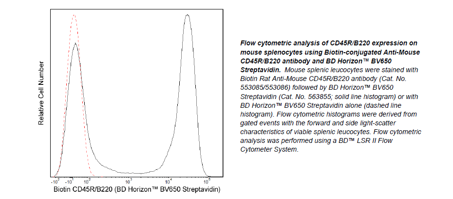 Streptavidin was conjugated to BD Horizon BV650 which is part of the BD Horizon Brilliant™ Violet family of dyes. This dye is a tandem