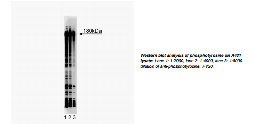 Phosphorylation of specific tyrosine residues is the result of of activation or stimulation or stimulation of their respective protein tyrosine kinases. The phosphorylated proteins can be autophosphorylated kinases or certain cellular protein substrates that are regulated in oncogenesis or cell growth. Antibodies to phosphotyrosine provide one of the best tools for the detection and characterization of phosphotyrosine proteins. Technical Note: The use of milk-containing buffers may interfere with a phosphotyrosine antibody's ability to bind specific proteins of interest. Please use BSA-containing buffers for blocking and incubating purposes. This antibody is routinely tested by western blot analysis. Other applications were tested at BD Biosciences Pharmingen during antibody development only or reported in the literature.