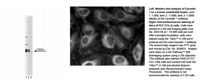 Identified as a tyrosine phosphorylated protein in Rous sarcoma virus-transformed chick embryo fibroblasts (CEF), caveolin is now known to be ubiquitously expressed. Caveolin (also known as VIP21) localizes to non-clathrin membrane invaginations (caveolae) on the inner surface of the plasma membrane. This transmembrane protein plays a structural role in these specializations. Caveolin is also present at the trans-Golgi network (TGN) and similar quantities are found in apically and basolaterally destined transport vesicles. Caveolin is part of a complex containing glycosylphosphatidylinositol (GPI)-linked molecules and cytoplasmic signaling proteins. Caveolin is a transmembrane adaptor molecule that can simultaneously recognize GPI-linked proteins and interact with downstream cytoplasmic signaling molecules, such as c-yes, Annexin II, and hetero-trimeric G proteins. Caveolin-1 can generate two forms, α and ß, due to alternate splicing of the mRNA. Caveolin-1 forms large lipid-binding homo-oligomers which are believed to play a role in caveolae formation. It may also function as a scaffolding protein which concentrates and organizes signaling molecules, a role supported by the fact that caveolin-1 interacts directly with inactive Ras and G-protein α subunits.