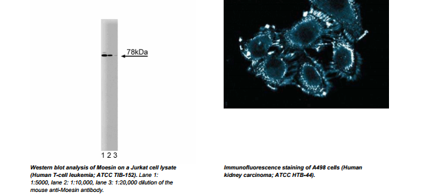 Moesin belongs to a family of proteins that includes ezrin and radixin. These proteins are co-expressed in a variety of cells. They localize to the cytoskeleton and modify interactions between cytoskeletal and membrane proteins. There is approximately 70% homology between moesin and ezrin and 80% homology between moesin and radixin. Moesin is intracellular and contains multiple conserved domains that are putative phosphorylation sites. It has a calculated molecular weight of 67.8 kDa, but migrates in SDS-PAGE at approximately 78 kDa. This discrepancy is likely due to a charged alpha-helical region within the protein