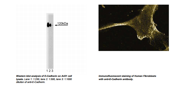 E-Cadherin is a 120kDa transmembrane glycoprotein that is localized in the adherens junctions of epithelial cells. There, it interacts with the cytoskeleton through the associated cytoplasmic catenin proteins. In addition to being a calcium-dependent adhesion molecule, E-Cadherin is a critical regulator of epithelial junction formation. Its association with catenins is necessary for cell-cell adhesion. These E-cadherin/catenin complexes associate with cortical actin bundles at both the zonula adherens and the lateral adhesion plaques. Tyrosine phosphorylation can disrupt these complexes, leading to changes in cell adhesion properties. E-Cadherin expression is often down-regulated in highly invasive, poorly differentiated carcinomas. Increased expression of E-Cadherin in these cells reduces invasiveness. Thus, loss of expression or function of E-Cadherin appears to be an important step in tumorigenic progression.