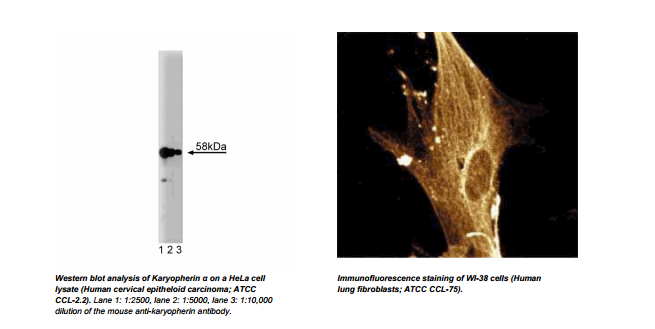 The two step process of importing proteins into the nucleus involves the binding and interaction of several cytosolic and nuclear pore proteins. Proteins to be translocated into the nucleus contain a nuclear localization sequence (NLS) which is recognized and bound by carrier proteins in the cytosol. Heterodimers belonging to a highly conserved family of proteins called karyopherins are required for successful nuclear localization of cytosolic proteins. The α-subunits appear to function in the binding of NLS (both simple and bitartite NLS motifs), but both α- and β-subunits are required for successful docking to the nuclear envelope. ATP is required for complete translocation of proteins into the nucleus. Karyopherin α2 was first identified as Rch-1, an NLS receptor which interacts with the RAG-1 recombination-activating protein in developing B and T cells. Rch-1 has been reported to be 44% identical to karyopherin α1 (hSRP-1 /NPI-1). This antibody is routinely tested by western blot analysis. Other applications were tested at BD Biosciences Pharmingen during antibody development only or reported in the literature.