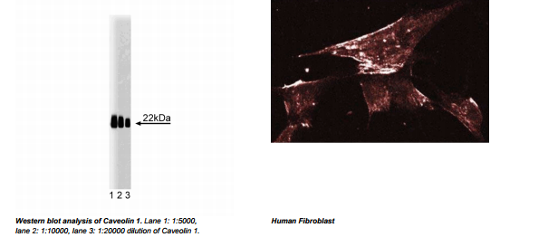Identified as a tyrosine phosphorylated protein in Rous sarcoma virus-transformed chick embryo fibroblasts (CEF), caveolin is now known to be ubiquitously expressed. Caveolin (also known as VIP21) localizes to non-clathrin membrane invaginations (caveolae) on the inner surface of the plasma membrane. This transmembrane protein plays a structural role in these specializations. Caveolin is also present at the trans-Golgi network (TGN) and similar quantities are found in apically and basolaterally destined transport vesicles. Caveolin is part of a complex containing glycosylphosphatidylinositol (GPI)-linked molecules and cytoplasmic signaling proteins. Caveolin is a transmembrane adaptor molecule that can simultaneously recognize GPI-linked proteins and interact with downstream cytoplasmic signaling molecules, such as c-yes, Annexin II, and hetero-trimeric G proteins. Caveolin-1 can generate two forms, α and β, due to alternate splicing of the mRNA. Caveolin-1 forms large lipid-binding homo-oligomers which are believed to play a role in caveolae formation. It may also function as a scaffolding protein which concentrates and organizes signaling molecules, a role supported by the fact that caveolin-1 interacts directly with inactive Ras and G-protein α subunits. This antibody is routinely tested by western blot analysis. Other applications were tested at BD Biosciences Pharmingen during antibody development only or reported in the literature.