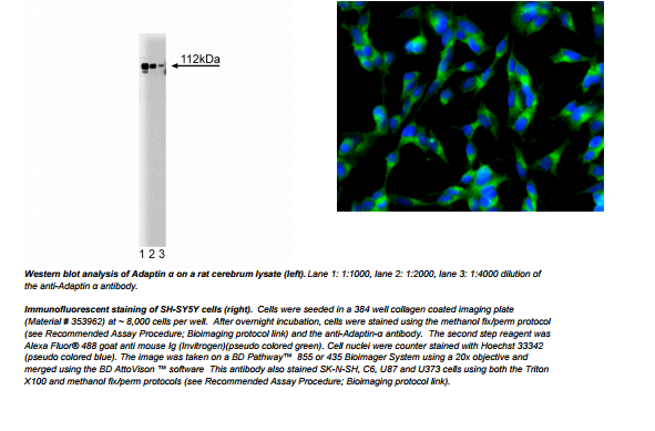 Sorting of integral membrane proteins at various stages of the endocytic and secretory pathways is mediated by vesicular trafficking between a variety of organelles. Two sorting signals are tyrosine-based and dileucine-based signals that interact with heterotetrameric adaptor protein complexes (AP-1, AP-2, AP-3, and AP-4), which are associated with the vesicle coats. These coatomers contain two large Adaptin proteins (α, γ, δ, or ε and β1, β2, β3, or β4, respectively) that are noncovalently linked to one medium chain (µ1, µ2, µ3, or µ4) and one small chain (σ1, σ2, σ3, or σ4). The AP-1 and AP-3 complexes are involved in protein sorting from the TGN and endosomes, while AP-2 adaptor complexes are involved in clathrin-mediated endocytosis. In the AP-2 complex, Adaptin α is expressed in two very similar isoforms from two different genes. Adaptin α [A] (112kDa) is expressed primarily in brain, while Adaptin α [C] (105kDa) is expressed in brain, liver and other tissues.