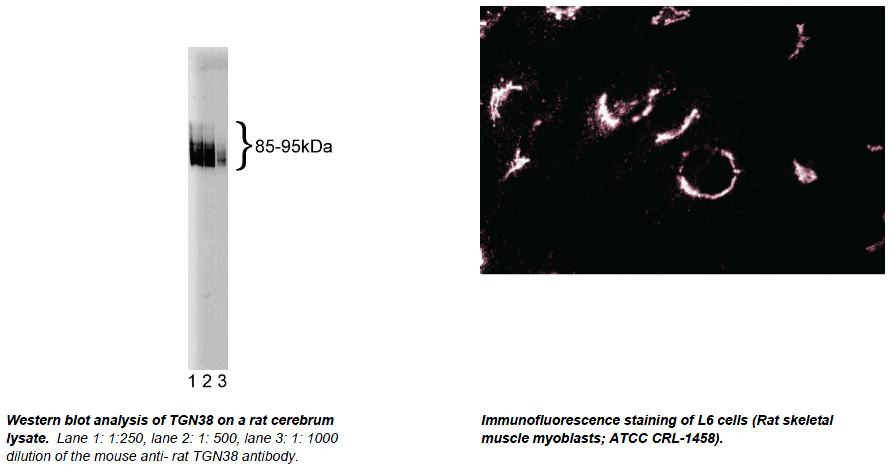 heterodimerize with TGN41 and participate in exocytic budding from the TGN. TGN38 has a molecular weight of 85 to 95 kDa. The core