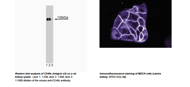 Integrins are a family of dimeric proteins that mediate cell-to-cell and extracellular matrix adhesion. They consist of a large α chain that is non-covalently associated with a smaller β chain which defines the integrin subfamilies. VLA-3 (Very Late Antigen-3), a member of the integrin superfamily, exhibits elevated expression on B lymphocytes, but is also found on monocytes, platelets, and hematopoietic progenitor cells. A heterodimer of α3 (CD49c) and β1 (CD29) subunits, VLA is a receptor for laminin, fibronectin, and collagen. The α3 chain contains a large extracellular domain with three putative metal-binding sequences, a transmembrane domain, and a short cytoplasmic tail. Differing requirements for divalent cations and the influence of RGD peptides results in multiple ligand-binding mechanisms for VLA-3. Although its expression is restricted in normal tissues, VLA-3 is found on a variety of cultured tumor cells. In addition, levels of VLA-3 have been shown to correlate with the degree of invasiveness of malignant melanoma cells. Thus, VLA-3 mediates intercellular adhesion and cell migration in normal and, possibly, cancerous cell types.