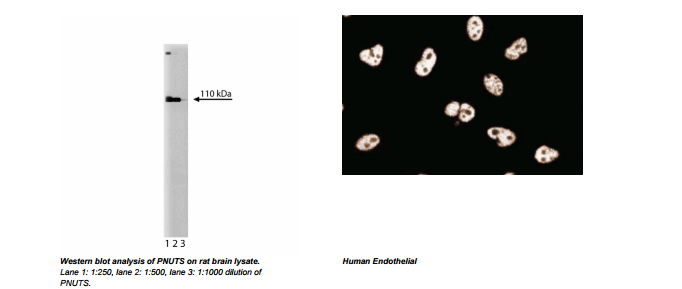 Many aspects of cellular physiology are influenced by the serine/threonine protein phosphatase1 (PP1). It is a highly conserved eukaryotic protein that reverses the action of protein kinases. PP1 is key to such processes as cell division, neuronal metabolism, and protein synthesis. It consists of a catalytic subunit, with a broad substrate specificity, whose action is directed by its association with a family of regulatory proteins including inhibitor-1, inhibitor-2, and NIPP-1. In response to extracellular stimuli, these proteins interact with PP1 and inhibit its catalytic activity. Other regulatory proteins are referred to as targeting subunits because they direct PP1 to specific subcellular locations and modulate its activity. In the cell nucleus, PP1 has been implicated in a variety of processes. Nuclear PP1 exists in high MW complexes with other proteins including NIPP-1. PNUTS (phosphatase 1 nuclear targeting subunit) is a ubiquitously expressed nuclear protein that forms a stable complex with PP1 and is thought to modulate its catalytic activity. Thus, PNUTS is a specific regulatory protein that directs the nuclear function of PP1.