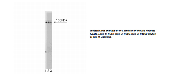 Cadherins are a family of transmembrane glycoproteins involved in the Ca2+-dependent cell-cell adhesion that occurs in many tissues. Members of this family include P-Cadherin, E-Cadherin (uvomorulin), N-Cadherin, R-Cadherin, Cadherin-5, L-CAM, and EP-Cadherin. These proteins are similar in their domain structure (45-74% amino acid conservation), Ca2+ and protease sensitivity, and molecular weight. However, cadherins have distinct tissue expression patterns and immunological reactivities. M (muscle)-Cadherin, another member of the Cadherin family, was discovered in myogenic mouse cells where it is present at low levels in myoblasts. It is expressed in prenatal and adult skeletal muscle and plays a role in skeletal muscle cell differentiation, particularly the fusion of myoblasts into myotubes. It is upregulated upon induction of myotube formation. M-Cadherin also forms complexes with the catenins in skeletal muscle cells, which then interact with the cytoskeleton. Therefore, it is thought that the M-Cadherin-cytoskeleton interaction may play a role in aligning myoblasts during fusion.