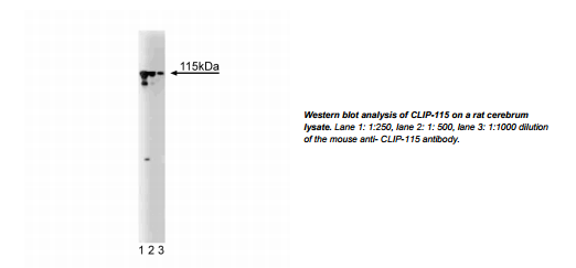 Microtubules, integral components of the cytoskeleton, are essential for establishment of cell polarity, membrane structure organization, and organelle translocation. Cell polarity is accomplished through the linkage of microtubules to other cytoskeletal proteins by microtubule associated proteins (MAPs). Likewise, the process of organelle translocation requires accessory proteins that link the organelles to microtubules. These proteins are known as CLIPs (cytoplasmic linker proteins) and belong to a novel family of microtubule binding proteins that are characterized by the presence of N-terminal microtubule binding (MTB) domains. CLIP-115 was discovered due to its high degree of homology to CLIP-170 (restin), which links endosomes to microtubules. Like CLIP-170, CLIP-115 contains two MTB domains and a long coiled-coil region. CLIP-115 has been reported to be found primarily in the brain where it associates with microtubules and the dendritic lamellar body (DLB). DLBs have been reported to be organelles that are present exclusively in the bulbous dendritic appendages of neurons. It is thought that CLIP-115 is a protein constituent of DLBs and is responsible for determining their structure and cytoplasmic location.