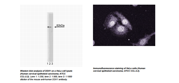 DEAD box proteins, a family of putative RNA helicases, are characterized by eight conserved amino acid motifs that are arranged in a core region as found in the prototypical member of the family, eIF-4A. The family's name is derived from the amino acid sequence Asp-Glu-Ala-Asp (DEAD) that is located within the ATP hydrolysis motif. DEAD box proteins have been implicated in translation initiation and RNA splicing, degradation, and stability. The DEAD box protein, DDX1, was identified in retinoblastoma cell lines, where it is coamplified with MYCN, a member of the MYC transcription factor family. DDX1 is expressed at elevated levels in fetal tissues of neural origin (retina and brain). It is both cytoplasmic and nuclear in DDX1-amplified neuroblastoma and retinoblastoma cell lines. However, it localizes specifically to the nucleus in non-amplified cell lines. Thus, DDX1 is thought to be involved in nuclear RNA metabolism. In addition, the decrease in mean disease-free survival of neuroblastoma patients exhibiting coamplification of DDX1 and MYCN as compared to those exhibiting MYCN amplification indicates a possible role for DDX1 in cancer formation in neural tissues.